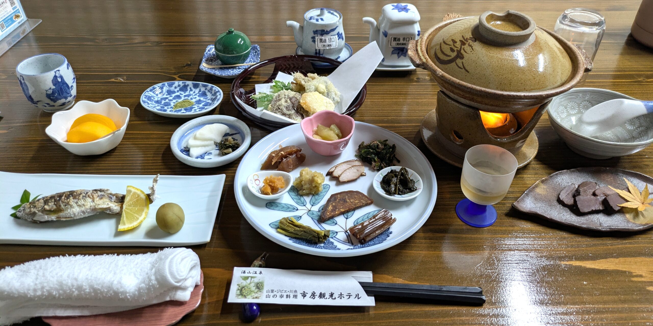 十種の山菜とヤマメ、鹿肉の紅茶煮など地元でとれた食材を中心としたメニューです。オーナーから「こちら(十種の山菜)名前もわからないと思いますが…解説しますか?」と言われたので内心(いうて知ってるやろ…)と思い「名前だけ…」とお願いしたところ、「まずこちらが、べにばなぼろぎくで…こちらがぎしぎし…」はい、一瞬で心折れました。なんです?べにばなぼろぎくて濁点多すぎないですか?ぎしぎし???結局のところ半分も知らなかったです。すみませんでした…。食べている途中で別の部屋から同じ問答が聞こえてきたので、定番になっているぽいですね。使われている山菜の写真が入ったファイルが用意されている周到さ笑。山菜以外にも魚もうまい、鹿肉もうまい。おひついっぱい用意されたご飯、最初は食べきれるか不安でしたが、余裕過ぎました。むしろ足りないくらい。うまい。