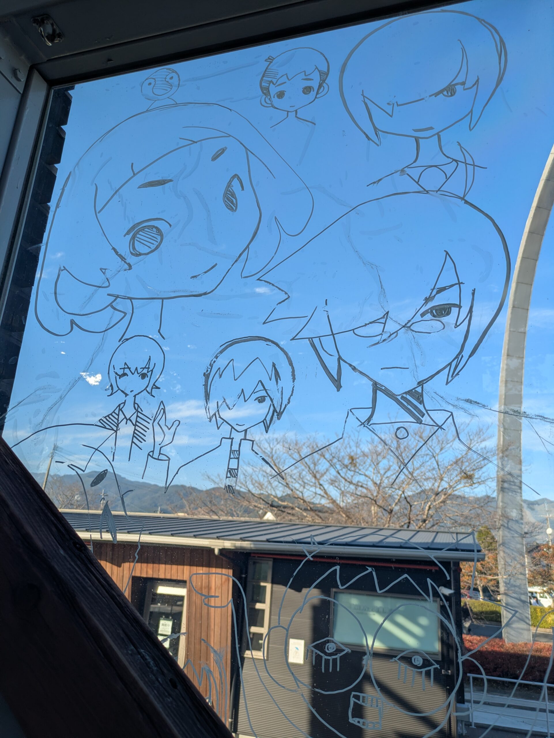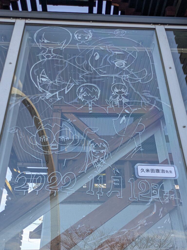 湯前まんが図書館前のやぐらみたいなところには、過去に漫画フェスタに参加された先生方のイラストが描かれていました。