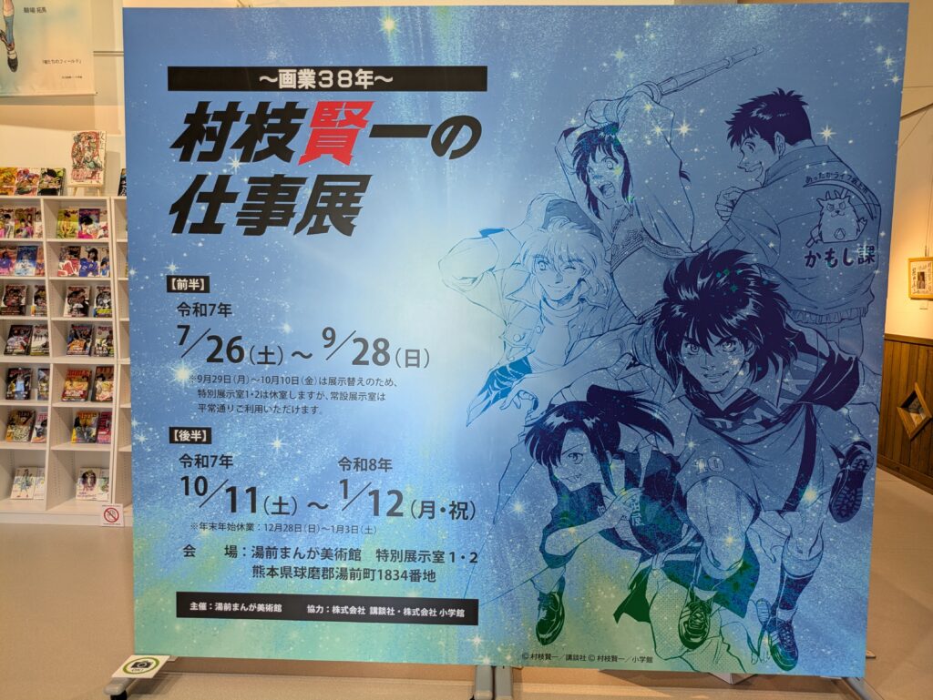 メインイベントは終わりましたが、せっかくのお祭り最後まで楽しみます。次に来たのは湯前まんが美術館。企画展ではトークショーにも出演されていた村枝先生の「~画業38周年~ 村枝賢一の仕事展」が行われていました。